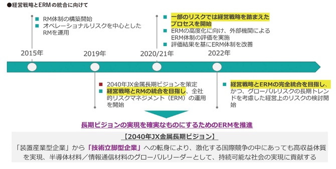 JX金属は、10数年ほど前からリスクマネジメントの活動、すなわちリスク把握調査とその対応のモニタリングを開始したが、それを継続的な取り組みとして定着させるまでには至らなかった。その状況を踏まえ、2015年にはリスクマネジメントの組織を設置するとともに、社長諮問機関としての会議体をスタートさせ、以降、改善を重ねつつ今日に至っている。