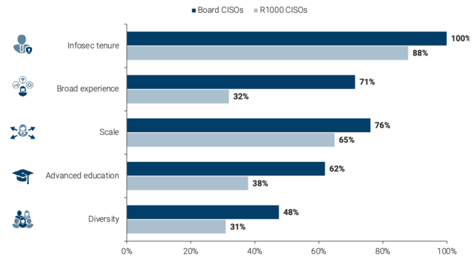 図1は調査対象のCISOがこれらの特質を備えているかどうかを判定した結果である。この中で「R1000 CISOs」とはラッセル1000指数の企業のCISO(つまり調査対象全体)、「Board CISOs」とは調査対象のうちCISOと取締役を兼ねている人だけに絞った場合の割合を、それぞれ示している。