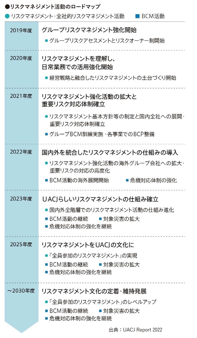 アルミニウム総合メーカーのUACJは、グループ会社を含め約1万人の従業員が国内外で活動する。同社がリスクマネジメントの強化に乗り出したのは2019 年。リスクマネジメント部と各事業・本部に配置されたリスクマネジメント推進担当者らが中心となり、グループの重要リスクと部門固有のリスクに対応する体制を構築した。経営レベルで戦略的にリスクを管理していく仕組みが整いつつある。