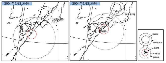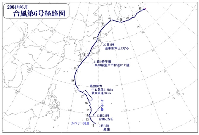 その2004年には、早くも6月に2個の上陸台風が現れ、いずれも高知県に上陸した。11日に上陸した第4号は史上5番目、21日に上陸した台風第6号は史上10番目に早い上陸台風である。台風第4号による死者・行方不明者はなく、浸水被害が37棟発生したほか、交通機関に影響が出た。台風第6号では、死者・行方不明者5人、負傷者116人、住宅損壊224棟、浸水61棟などの被害が発生した。