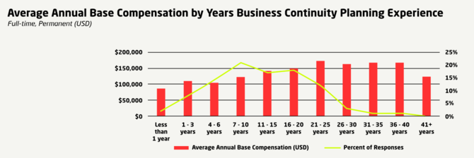 なお本報告書では企業におけるBCM従事者(Full-time, Permanent)とコンサルタント(Self-employed, Independent Contract Consultants)とは区別して集計されており、図1は前者のデータである。日本からの回答者の平均は99,170米ドル(約1,435万円)とのことであるから、図1と比べると日本企業におけるBCM従事者の報酬水準は若干低いと言わざるを得ない(注4)。