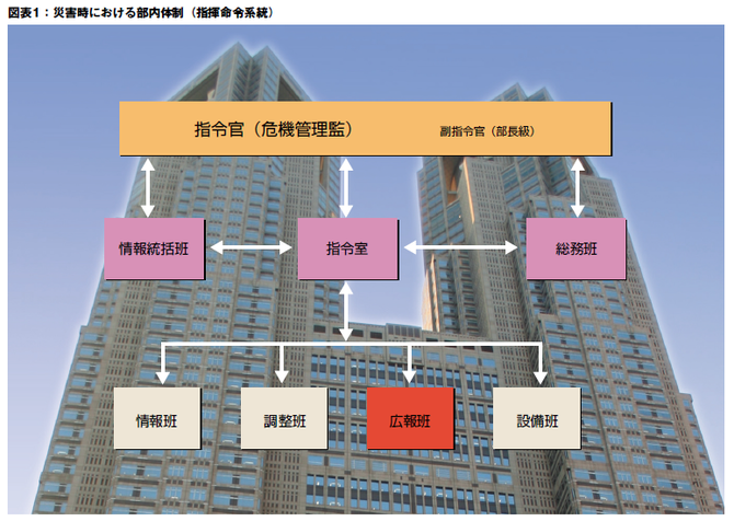 都総合防災部は、危機事案発生時の初動から応急対策、広報対応、復旧に至るまで、すべての中心的役割(対策本部の事務局機能)を担う。危機事案が発生すると、指令官(危機管理監)をトップに指令室、総務班、情報統括班などの班組織が編成され、連携を取りながら対応にあたる。指令室の下には、庁内の各局や防災関係機関などとの調整を行う調整班、防災システムの運営・維持にあたる設備班、区市町村からの被害状況等を収集する情報班、そして広報班が設けられる(図表1)。各班とも、班長、副班長および主要メンバーが、直ちに都庁舎に参集できるよう、徒歩10分~30分圏内にある災害対策住宅で生活している。