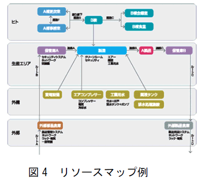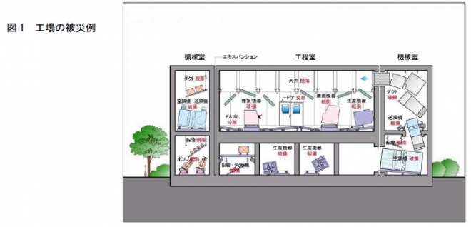 このように工場において「生産を継続させる」という視点でその機能を細かくひも解いてみると、ファシリティだけ考えても様々な経営資源(リソース)があり、それらリソース1つが損傷しても生産が停止する可能性がある。例えば構造体の耐震性をいくら高めてもクリーンルームを構成するパーティションの転倒や天井・空調ダクトが落下すれば生産ラインは停止する。あるいは生産受注・発送に必要なシステムが停止しても生産活動に支障をきたす。生産は全く問題なく稼働していても、自動倉庫が被災しては出荷ができない。