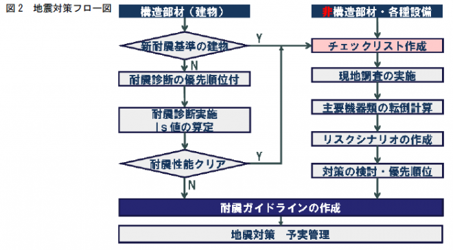対象リスクが地震であれば図2のようなフローが考えられる。まず確認すべきは構造体の耐震性である。1981年以前の旧耐震基準で施工された建物であれば耐震診断を実施し、Is値という数値からどれくらい耐震性があるかを評価する。構造体が所定の強度を確保していれば、次は非構造部材や建築設備・生産装置の評価を行う。