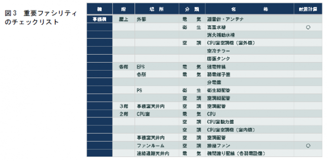 最初に重要ファシリティのチェックリスト(図3)を作成し、現地調査や機器の転倒計算などを行い、その結果どのように被災するかをシナリオにする。シナリオにすることで被災状況がよくわかり、社内の共有認識として活用が可能となる。そして重要業務への影響度などから対策の優先順位を決め、ガイドラインとしてまとめ、地震対策を実施し管理する。ガイドラインとしてまとめることで各工場の対策レベルや方法を統一し、実施管理がしやすくなるといったメリットがある。