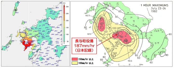 図3(左)に、1982年7月23日の日降水量分布を示す。この日の豪雨が長崎県南部に集中したことが分かる。図3(右)は、最大1時間降水量の分布である。長崎市の北にある長与(ながよ)町の役場で、7月23日20時までの1時間に観測された187ミリメートルは、最大1時間降水量の日本記録とみられている。