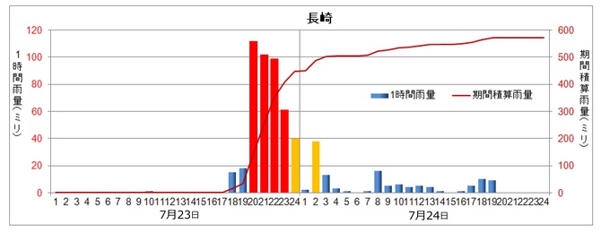 図2に、長崎海洋気象台(当時)における1時間雨量と積算雨量の経過を示す。この豪雨は、23日の夕刻からおよそ9時間の出来事であった。23日17時から24日2時までの積算雨量は約500ミリメートル、24日夜までの降雨も加味すると、総雨量は約570ミリメートルであった。