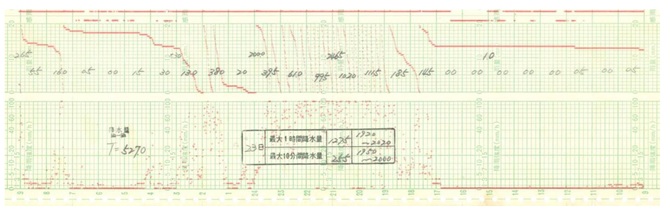 図1は、長崎海洋気象台(現在は長崎地方気象台)における長崎豪雨時の雨量計の記録で、上段が雨量(ミリメートル)、下段が降雨強度(ミリメートル/時)を示す。当時はこのように、雨量の推移が記録紙上にペンで自動記録されていた。この種の気象資料を「自記紙(じきし)」という。薄緑色で印刷されている目盛線は、雨量については1ミリメートル間隔で上下幅が20ミリメートル、降雨強度については上端が100ミリメートル/時になっている。時間軸は横軸であるが、時間が右から左へ進行することに注意されたい。