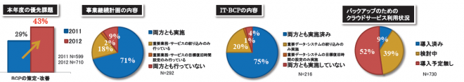 本年度の優先課題としては、事業継続計画とIT-BCPの策定と改善を挙げる企業が昨年から14%も増加し、トップとなった。半面、事業継続計画、IT-BCPともに内容に難ありとした企業が約3割あり、整合性の確保に課題が残った。このほか、クラウドサービスをバックアップに利用することを検討中の企業が約半数に上り、クラウドへの期待の高さを裏付けた。
