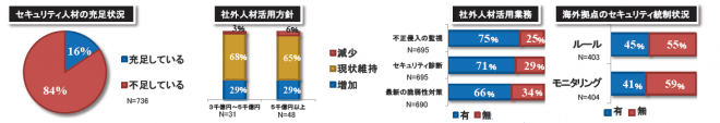 人材に関する課題としては、8割以上の企業でセキュリティ人材の不足感を持っていることが明らかになった。大企業においては、社外人材の活用を増やす動きも加速しており、専門性が必要なセキュリティ活動では委託に対するニーズもある。また、国内拠点に比べ、海外拠点でのセキュリティ統制に遅れがあることも浮き彫りになった。