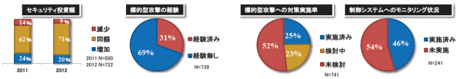 同調査結果によると、企業のセキュリティ投資額は、昨年と比べて増加したとの回答は4%減り、逆に現状維持は10%近く増えた。一方で、大企業を中心に約3割の企業が標的型攻撃を経験しているのに対し、対策の実施率は「実施済み」「検討中」を併せても5割以下にとどまった。