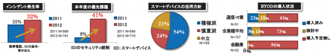 近年、積極的に導入が進められているスマートデバイスだが、今回の調査では、携帯電話やスマートデバイスの置き忘れが昨年と比べ7%も増加し、セキュリティインシデントのトップになった。本年度の課題としてスマートデバイスのセキュリティ統制を課題に挙げる企業が前年比33%も急増している。