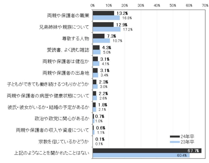 提示された「面接では不適切な質問」12項目のうち、どれも「聞かれたことはない」と答えたのは23年卒が60.4%、24年卒が67.7%となっています。去年と比べて改善していますが、それでもまだ32.3%がなんらかの不適切な質問を聞かれた経験があるということです。