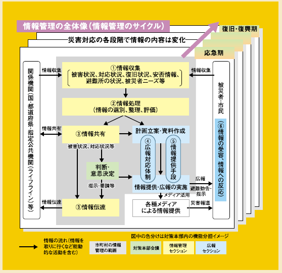 第5回会議では、「情報収集から情報提供・広報」まで、災害時における情報管理の全体像を整理するとともに、各段階における課題や対策を検討。被災した市町村においては、被災住民や全国の関係者に適宜・適切な情報発信、広報活動を行っていくことが重要であることから、被災市町村の広報に関する経験や教訓を整理し、対策本部の情報発信や、広報活動の充実につながるような方策を議論した。
