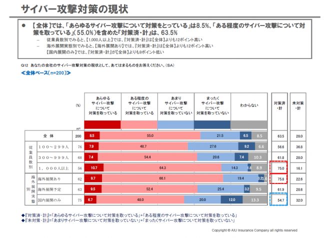 また情報漏えいの原因としてサイバー攻撃を挙げる経営者が少なからずいるという結果をこの調査は得ているが、その対策はというと不十分な企業も全体の3割近くあるようだ。(グラフ4)
