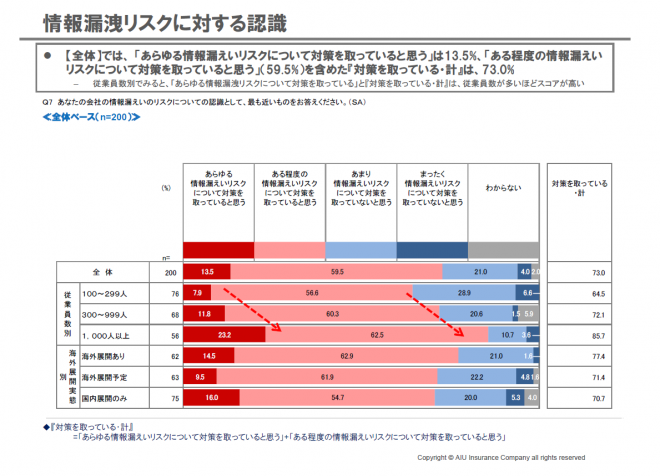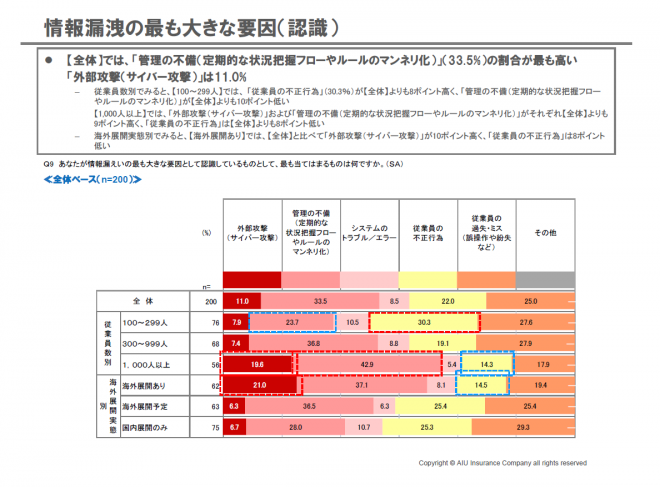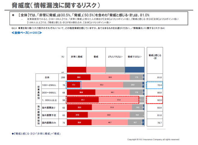 AIU保険が企業の経営者200人を対象に行った調査によると、コンプライアンスや自然災害、外部からのサイバー攻撃、情報漏えい、為替変動など事業を取り巻くリスク因子のうち「情報漏えいに関するリスク」に脅威を感じる経営者の割合が全体の8割(81.0%)にものぼり、外部からのサイバー攻撃のリスク(67.5%)とあわせて「情報セキュリティ」に関する意識が強いことが浮き彫りとなった(グラフ1)。また同調査からは従業員数100-299人規模の企業や海外展開している企業において、情報セキュリティ対策が不十分な状況であることが見てとれた。
