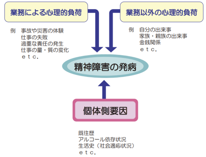 精神障害は、仕事のよるストレスや私生活でのストレスと、そのストレスへの個人の対応力の強さとの関係で発病に至ると考えられています。発病した精神障害が労災認定されるのは、その発病が仕事による強いストレスによるものと判断できる場合に限られます。