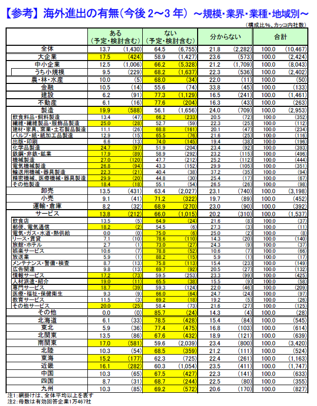 地域別では、『南関東』(同17.0%、581社)や『近畿』(同16.1%、282社)『東海』(同15.2%、177社)が高く、都市圏で海外進出意向が強くなっている様子がうかがえる。