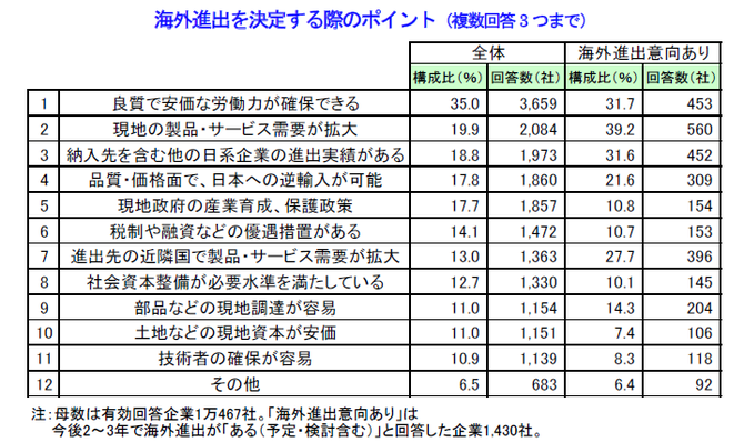 ■海外進出を決めるポイント、「良質で安価な労働力の確保」が最多