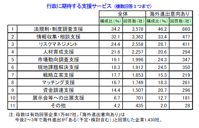 自社が海外事業を進めるうえで、行政(国・自治体)に期待する支援サービスについてニーズの高いものを尋ねたところ、「法規制・制度調査支援」が1万467社中3578社、構成比34.2%(複数回答3つまで、以下同)で最多となったほか、「情報収集・相談支援」(同32.1%、3362社)を3社に1社が挙げた。次いで、「リスクマネジメント」(同24.4%、2558社)、「人材育成支援」(同21.6%、2257社)、「市場動向調査支援」(同19.1%、1996社)が続いた。