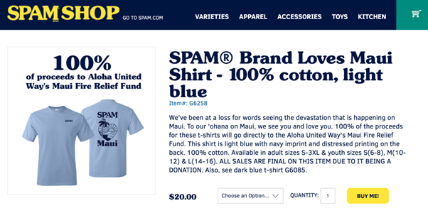また、ホーメル・フーズは、"SPAM® Brand Loves Maui "と書かれたTシャツの販売を開始しました。このTシャツの収益の100%は、マウイ島火災救済基金として、アロハ・ユナイテッド・ウェイという団体に寄付される予定です。さらに、同社は地元のフードバンクへの募金活動にも協力を続けています。