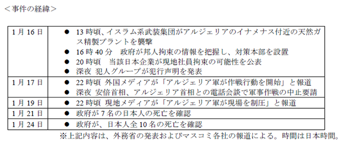 2013年1月16日、アルジェリアのイナメナス付近の天然ガス精製プラントをイスラム系武装集団が襲撃し、本プラント建設に従事していた関係者が拘束され、日本人10名を含む33名の外国人が亡くなるという大惨事となった。33名は、日本人10名、フィリピン人8名、イギリス人3名、ノルウェー人3名、アメリカ3名、現時点で身元が確認できていない外国人が少なくとも6名と報道されている。(1月27日時点)