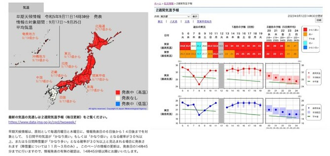 「早期天候情報」は、その時期として10年に1回程度しか起こらないような極端な高温の可能性が高まった時に発表されるもの、「2週間気温予報」とは地点ごとの最高気温、最低気温が把握できるものです。