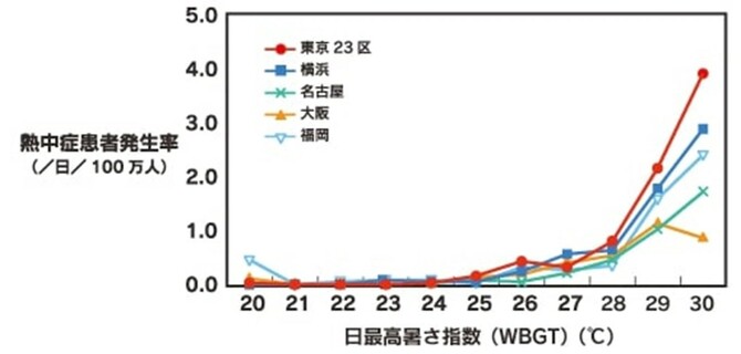 発表基準として使われる「暑さ指数」とは、気温、湿度、日射・輻射などの熱環境の影響を織り交ぜた数値です。熱中症警戒アラートの発表基準は暑さ指数33ですが、暑さ指数が28以上となると実際には熱中症患者が増えます(下図参照)。このため、「熱中症警戒アラートが出ていないから今日は大丈夫」と誤解しないようにしてください。特に普段から気温が低い北海道・東北・北陸地方では暑さ指数30前後の段階から熱中症関係の救急搬送者が大量に出ているという分析結果もあるため、「熱中症警戒アラート」未発表の段階から特別な注意が必要となります。