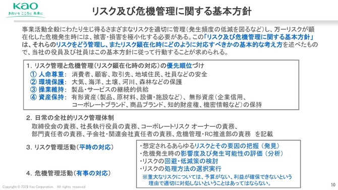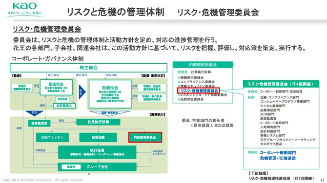 花王の危機管理で中核的な役割を果たしているリスク・危機管理委員会は、社長が委員長を務める内部統制委員会の関連委員会として設置したものだ。年に4回開催し、リスクの管理体制と活動方針を決め、リスク対応の進捗を管理している。リスク・危機管理委員会の委員長はコーポレート戦略部門の担当役員が担う。委員は主要部門を担当する執行役員や部長が務め、事務局は危機管理・RC推進部が担当。同部は国内外の関係会社を含めた花王グループのリスクと危機の管理活動を推進し、各部門や関係会社の取り組みを支援し、主管が不明確なリスクや危機の対応を進める。リスク・危機管理委員会の下部組織には、リスク・危機管理推進会議が設置されている。毎月1回開催され、各部門、関係会社の部長らがリスクの管理状況を報告し、議論を交わしている。なお、花王では経営目標の達成や事業活動に悪影響を与える可能性を「リスク」、リスクが顕在化した状態 を「危機」と定義している。