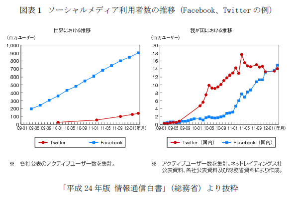 Facebook、Twitterに代表されるソーシャルメディアは、様々な形で浸透を見せている。統計によって若干の差は見られるが、Facebook、Twitterともに、日本においては現在、1500万人前後の利用者がいるとされている。(図表1)