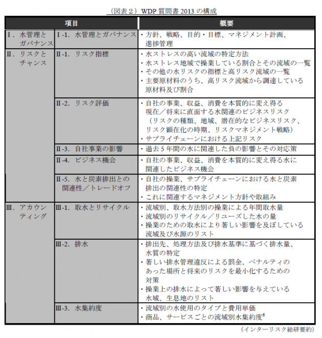 水リスクの情報開示の枠組みの代表例として、2013年のWDPの質問書の概要を図表2に示します。枠組みはガイドラインによって多少の違いはありますが、主な特徴として下記が挙げられます。