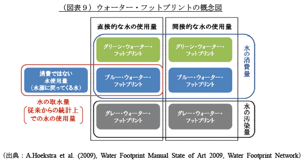製品・サービスや事業活動のライフサイクルにおける直接及び間接的な水使用量を算出するための手法として、ウォーター・フットプリント(WF)という考え方があります(図表9)。特徴としては下記の通りですが、従来の水使用量の概念から大きく拡張されていることがわかります。