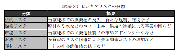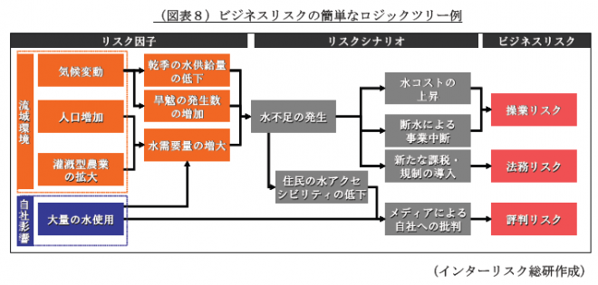 近年、気候変動、生物多様性でもそうであるように(※7)、物理的なリスク(水質の低下、水不足、水の大量使用という事象)だけでなく、経営視点でビジネスリスク/機会を評価することが重要です。ビジネスリスクは下記のように分類されます。