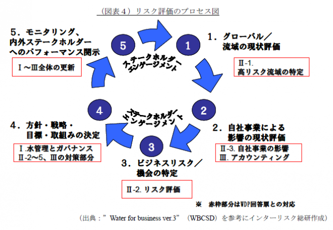 またISO14001も2015年に予定されている改訂で、より経営的視点からのビジネスリスク/機会の特定、それに基づいた戦略策定を要求する形式となることはほぼ間違いないでしょう(※9)。そのリスク評価プロセスも、これまで述べたリスク評価プロセスと差異はないと予想されます。そのため、マネジメントに要する経営資源の効率化のためにも、水リスクへの対応もISO14001の枠組みに一元化することが望まれます。