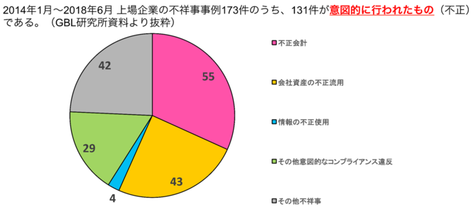 上場企業だからといって立派なリスク管理体制がとられているわけではない。第三者委員会ドットコムによれば、2014年1月から2018年6月までに発生した上場企業の不祥事事例173件のうち、131件が意図的に行われた不正であることが確認されている。