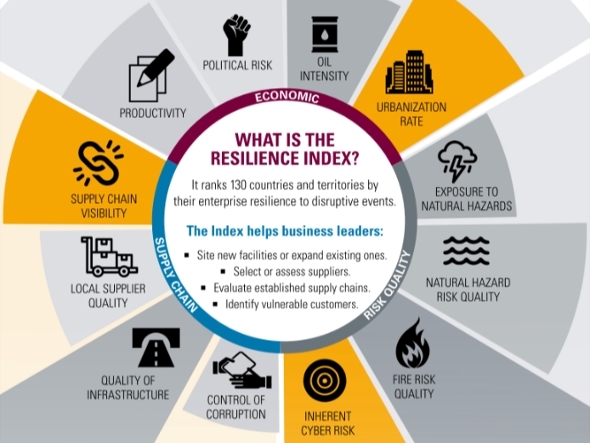 米国の損害保険会社FM Globalは同社のサイト上で「2018 FM Global Resilience Index」というデータを公開している。これは次のような情報源から得られた情報を基に約130カ国のビジネス環境に関するリスクを評価した結果をまとめたものである。