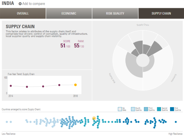 なお右側の円形の図のなかで、「Supply Chain」と書かれている部分の内側にある扇形の部分をクリックすると、それぞれの個別要因に関する評価結果が表示される。ちなみにインドの場合「汚職のコントロール」で 72位、「インフラの質」で 47位、「現地のサプライヤーの質」で 72位、「サプライチェーンの可視性」で 37位となっている。