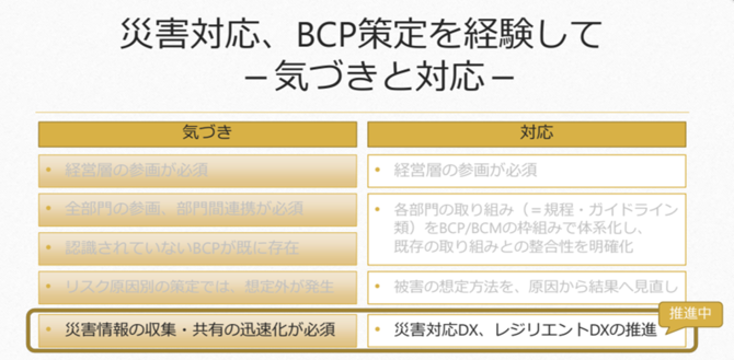 その後、東日本大震災やタイの洪水での経験を経て、あらゆる危機に対応できる「結果事象型」のBCPである「パナソニックグループBCM構築ガイドライン」を作成、国内外約200の事業場のBCPの策定およびBCMの構築を支援した。それでも災害時の情報共有には不安を残したままだった。