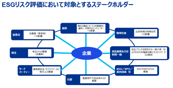 具体的には、株主や顧客(取引先・エンドユーザー)、サプライヤー、委託先、従業員、グループ会社、NGO(非政府組織)/NPO(非営利組織)などが想定されます。