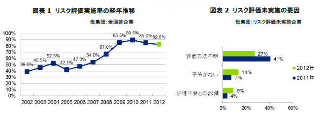 それによると、リスクマネジメントに関する活動のうち、潜在的リスクを識別・評価する「リスク評価を実施している」と回答した企業(以下、リスク評価実施企業)の割合は4年連続80%以上となった。2010年の89.5%をピークに、2011年85.0%、2012年82.6%と微減傾向となりつつも、高水準を保っている(図表1)。さらに、1年の間のリスクマネジメント体制が「現状維持である」と回答した企業がリスク評価実施企業の80%に上ることから、多くの企業においてリスクマネジメントが定常の業務及び体制として定着していることが明らかになった。