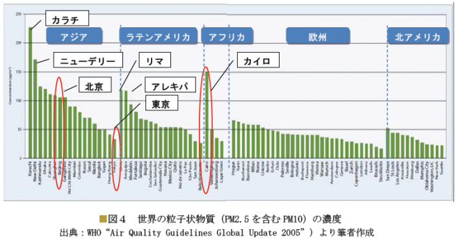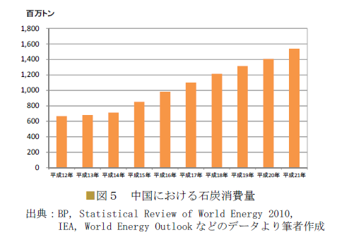 しかしながら、中国だけが粒子状物質の汚染がひどいわけではない。2005年に公表された少し古いデータとなるが、図4は、WHOが発表した、世界の粒子状物質(PM2.5を含むPM10)の濃度である。これを見ると、大気環境基準が策定され、対策が進んでいる欧州、北アメリカ地域では濃度が低くなっているが、経済発展が著しい東アジア(カラチ、ニューデリー等)、北アフリカ(カイロ等)、ラテンアメリカ(リマ、アレキパ等)の地域は汚染がひどいことが分かる。約10年前のデータであるが、北京より汚染が進んでいる都市も少なくはない。これは、日本も経験したように高度経済発展する一方、環境対策が置き去りにされていると見ても良いだろう。粒子状物質の汚染を引き起こす要因の一つである中国における石炭の消費量は、図5で示すとおりここ10年で2.3倍に増加しており、今後も増加すると予想されている。日本は東アジアで最も空気がきれいな地域であるが、中国における石炭消費量増加によって発生する汚染物質の一部は、越境移流で日本にも飛来し、九州地域、離島や高山地域のPM2.5濃度を高める要因となるだろう。