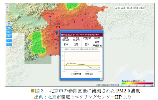 現在では、北京市環境モニタリングセンターなどでモニタリングデータを公開している。春節が終わった2月25日の測定値を見てみると、1日平均値で250μg/m3以上になっており(図3)1時間値では700μg/m3を記録した。このレベルは、環境省が外出を控えるように勧告した濃度レベルの3.5倍、WHOのガイドイラン値の10倍以上の濃度である。この原因は、北京市などは汚染物質が滞留しやすい気象条件となりやすく、自動車の排気ガス、集中暖房における石炭使用、発電所・工場排煙等によるPM2.5に関連する大気汚染物質の発生量が高度経済成長に伴い増加していることが挙げられている。