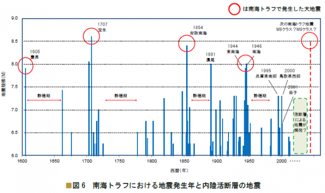 今回の地震発生直後には、南海トラフで発生する地震の震源域と今回の地震の震源が近いことから、南海トラフの地震との関係が注目された報道が目立った。多くの有識者がこの関係にコメントを寄せているものの、本地震が南海トラフの地震の前兆といったような、直接的な関係を指摘する声はない。しかしながら、南海トラフで大地震が発生する前後は、西日本の内陸で活断層による地震が頻発することが指摘されており、今後も、引き続き、そのような内陸の活断層による地震が発生するとの懸念が報じられている。図6にこの関係を示すが、南海トラフで発生する前後では、内陸の活断層において地震が頻発していることがわかる。最も新しい地震の発生は、1944年東南海地震、1946年南海地震であるが、それ以降、西日本では活断層での地震が静穏化した。そして、約50年を過ぎて発生した1995年兵庫県南部地震以降、2000年鳥取県西部地震、2001年芸予地震、今回の淡路島周辺の地震と、この数年でたてつづけに内陸活断層の地震が頻発した。今後も西日本では、内陸活断層の地震が発生する傾向が続き、近い将来に南海トラフ周辺で大地震となる可能性が高い。その後も、南海トラフの地震の地殻変動に伴う誘発地震が内陸においても頻発し、やがて活動が静穏化していくと考えられる。