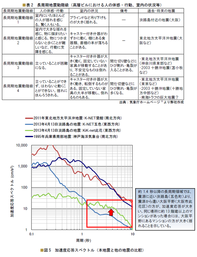 今回の地震で、防災科学技術研究所が観測した記録(10)の加速度応答スペクトルについて、東北地方太平洋沖地震と比較して図5に示す。約1.4秒以降の長周期成分では、震源に近い淡路島(K-NET 五色)より、震源から遠い大阪平野(KiK-net 此花)の方が、加速度応答が大きい。つまり、1.4秒より長い固有周期をもつ建物として、例えば、13階建以上のマンションが、両方の地に立っていた場合には、大阪平野にあるマンションの方が大きく揺れることを示している。震源から遠いからといって安心できないのがこの現象である。