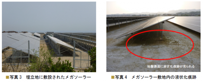 メガソーラーは広大な敷地を要することから、淡路島においては、平地に建設する場合は主に埋立地にて敷地を確保している。その他は、南側に面した山地中腹部を利用した立地となっている。メガソーラー発電所は、近年の再生エネルギー利用促進の政策により急速に増加したため、発電所自体が地震による大きな揺れを経験するのは今回が初めてであった。山地の発電所については、先に述べたように地盤が良好であるため、本地震による被害はほぼ皆無と見受けられた。一方、埋立地に建設されたものは、施設の被害はないものの、設置地盤に一部液状化の痕跡が見られた。但し、目視調査では地盤に目立った不陸(表面が凸凹であること)、沈下は見受けられなかった。