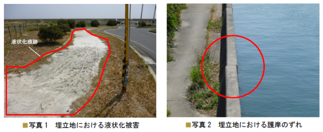 淡路島はそのほとんどが丘陵~山地から構成されている。平地部分は海岸線のごく一部や、洲本川河口部である洲本市街地周辺、松帆志知川河口部であり、平地部分が極めて少ない地形を有している。山地部分については一般的に地盤状況が比較的良好であり、今回の地震についても平地部分や埋立地での被害がほとんどで、山地部での被害は墓石や土壁の崩壊が一部見られるものの、限定的なものとなっている。地震被害の内容としては、海岸線付近では一部液状化により砂、泥の噴出が発生しており、歩道上舗装面の大部分が砂や泥で覆われた被害(写真1)や、埋立地護岸面において若干の側方流動による護岸のずれが見受けられた(写真2)。