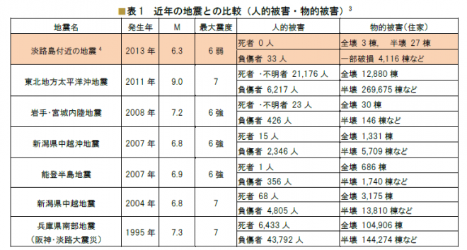 今回の地震を見ると、震源は淡路島のほぼ中心に位置し、強い揺れに見舞われた地域の人口や建物の棟数が比較的少なかったため、被害が少なかったといえる。同規模の地震であっても、都市の中心部で発生した場合には、甚大な被害が予想され、例え小さな規模の地震であっても、対策を怠ることはできない。