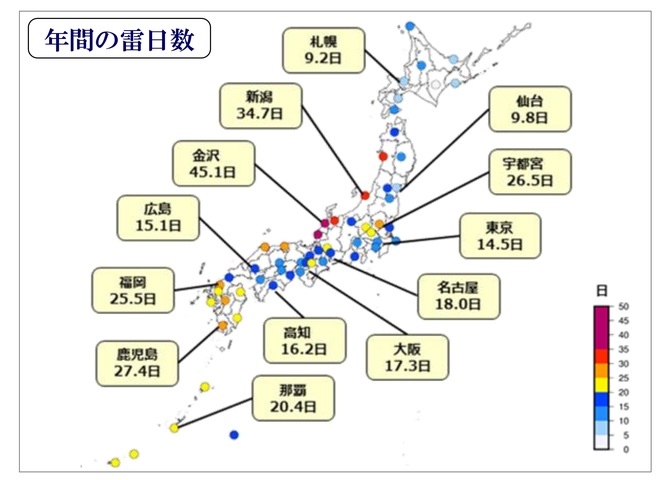 雷が観測された日数を雷日数という。年間の雷日数、すなわち、わが国で1年間に雷の発生する日数が最も多い地域はどこか。北関東あたりを思い描く人が多いのかもしれないが、実は異なる。図1は、気象庁のホームページに載っている平年の雷日数の分布図である。北関東は年間25日前後で、比較的多いことは確かだが、それは九州と同程度である。最も多いのは北陸から東北地方にかけての日本海側で、年間の雷日数は35~45日に達する。
