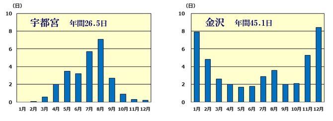図2は、月別の雷日数の平年値のグラフで、北関東の宇都宮と、日本海側の金沢について示されている。宇都宮では、夏の雷が多く、冬は少ない。これに対し、金沢では、夏の雷もそれなりに多いが、冬の雷が圧倒的に多い。この結果、年間の雷日数は、宇都宮の26.5日に対し、金沢では45.1日と多くなっている。