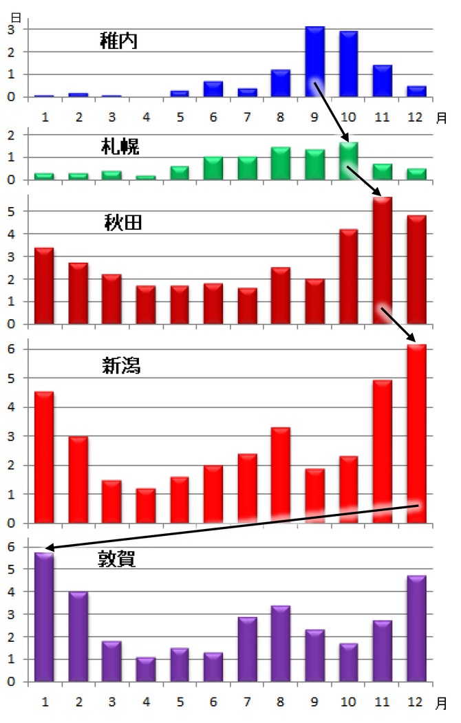 図4は、日本海側の幾つかの地点の平年の月別雷日数のグラフを、北から順に、上から下へ並べたものである。秋から冬に向かって、雷日数の最多月が南下していく様子を黒矢印で追跡した。